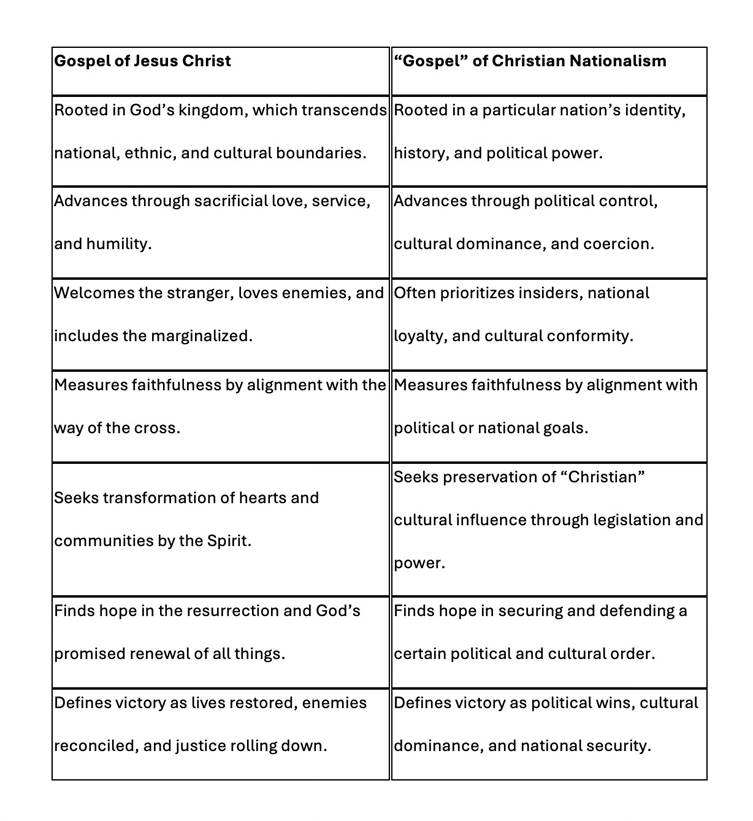 Christian nationalism opposes the gospel, kingdom, and way of Jesus Christ. The gospel of Jesus centers on self-giving love, humility, justice, and welcome for all, while Christian nationalism seeks power, control, and privilege for one group at the expense of others.