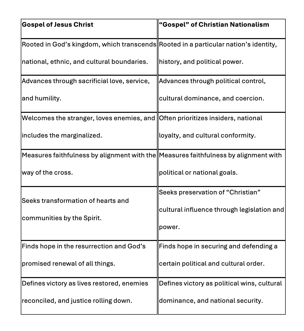 In contrast, the “gospel” of Christian nationalism is a political vision that fuses national identity with a particular expression of Christian faith. It claims that the security, moral health, and future of the nation depend on preserving its “Christian” character through political dominance, cultural control, and alignment of church with state. It tends to define faith in terms of protecting borders, preserving cultural traditions, securing influence, and wielding power to legislate morality. In this vision, loyalty to the nation is often intertwined with loyalty to God, and political victories are seen as spiritual triumphs.