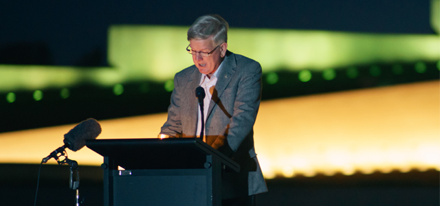 (Pictured) Former Uniting Church President Gregor Henderson lead prayers at a Voices for Justice Prayer Vigil outside Parliament House